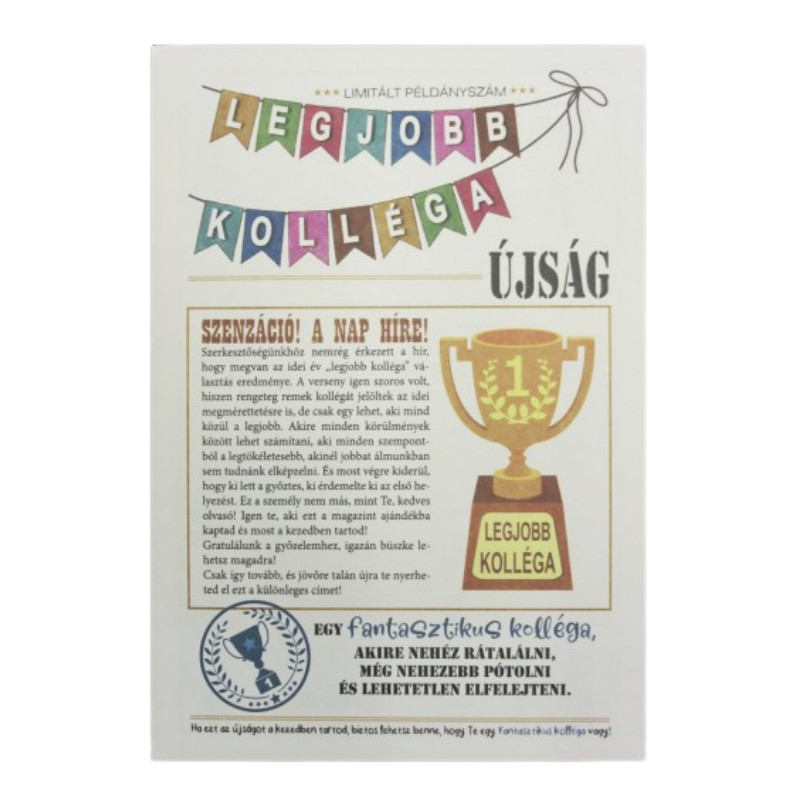 Könnyed és vicces meglepetés, amellyel kifejezheted, mennyire fontos számodra a kollégád! A Legjobb kolléga újság 8 oldalas, szórakoztató cikkekkel és humoros tartalommal mutatja be a kolléga legjobb tulajdonságait. Egyedi és emlékezetes ajándék, amely tökéletes választás születésnapra, névnapra vagy munkahelyi ünnepségre.